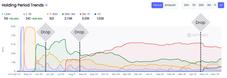 단, 에어드롭 발생 직후 시장이 신속하게 반응한다는 점에 유의해야 한다. 또한 프라이머리 컬렉션의 성숙도에 따라 장기 홀더가 증가하여 종종 가장 지배적인 보유 기간이 된다.