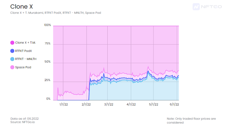 Clone X 에어드롭은 현재 ETH 기준으로 2022년 최고의 퍼포먼스를 보이고 있다. MNLTH는 12.43%, Space Pod는 214.11%를 상승하는 반면에 PodX는 2022년 6월 21일까지 연초 대비 유일하게 하락하여 62.41% 하락했다.