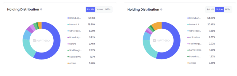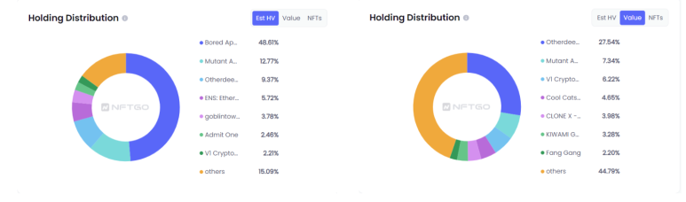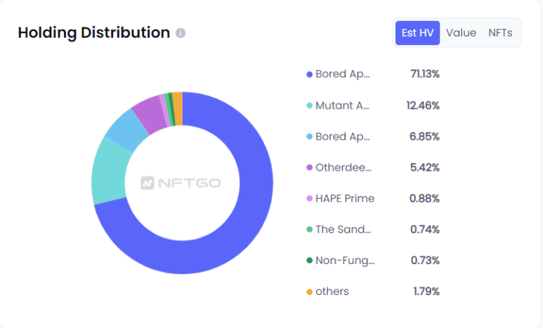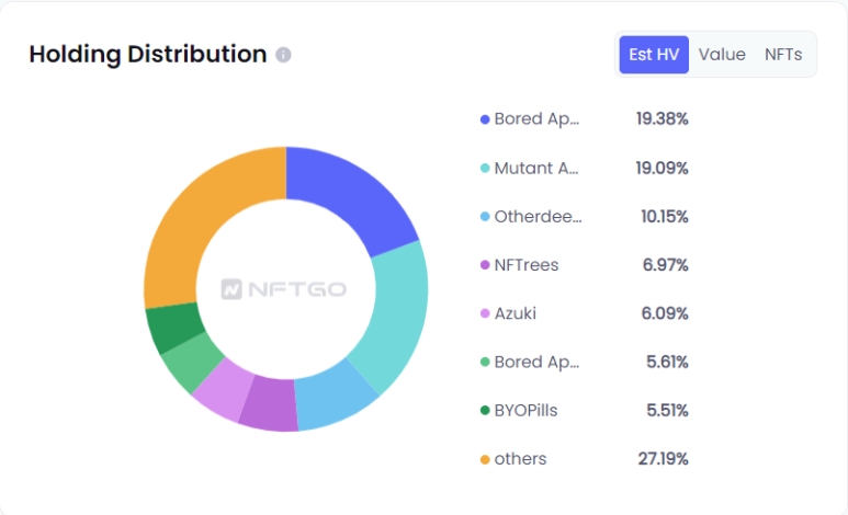 이 주소가 보유한 BAYC의 현재 추정치는 총 보유분포의 19.38%를 차지한다.MAYC는 최대 19.09%를 차지한다. 이러한 통계는 이 주소가 Yuga Labs의 큰 후원자임을 시사한다.