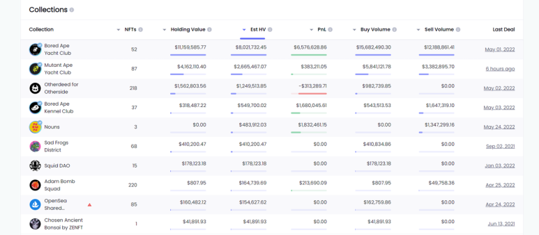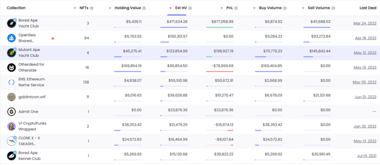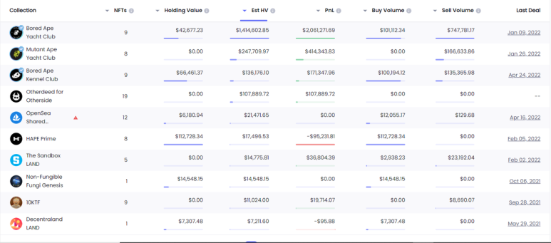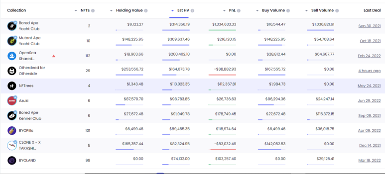 위의 표를 보면 More Loot과 BAYC 모두 HV가 0임을 알 수 있다.이것은 민팅이 이 주소가 해당 NFT를 얻기 위한 유일한 방법이었음을 나타낸다. 게다가 판매량에서는, 이 주소는 BAYC를 판매했지만, 아직 BAYC가 남아 있는 것을 알 수 있다.