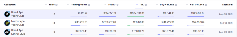 데이터에 따르면 이 주소는 BAYC를 통해 "저렴한 구매, 높은 판매" 투자를 성공적으로 달성했다. BAYC의 예상 PnL은 판매량 보다 훨씬 낮으며 포트폴리오에서 가장 높은 1,334,633.33달러에 달한다.