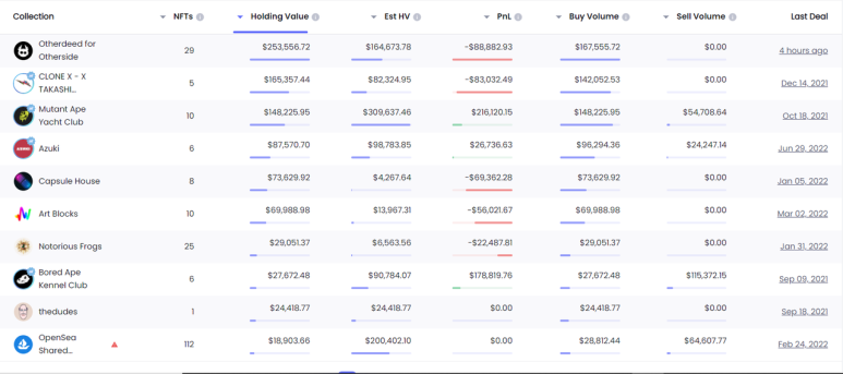 다음으로, 구입 시점에서 가치가 가장 높은 몇 안 되는 프로젝트가 유명한 우량주임을 알 수 있다.상기 MAYC 외에 Otherdeed, CLONE X, Azuki 등의 프로젝트도 구입했다.현재 Otherdeed와 CLONE X는 모두 8만달러 이상의 손실을 입은 채 여전히 손해를 보고 있다.