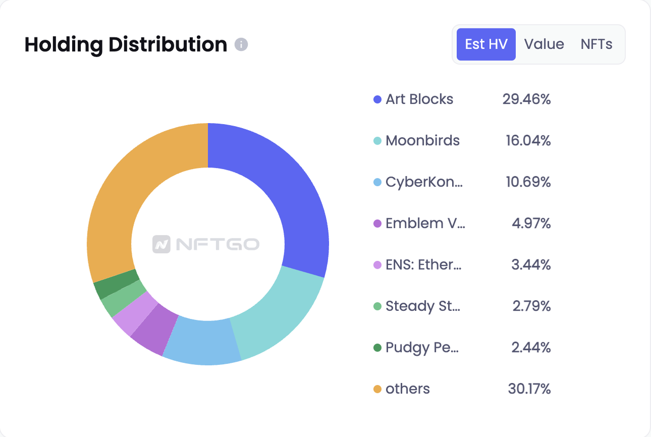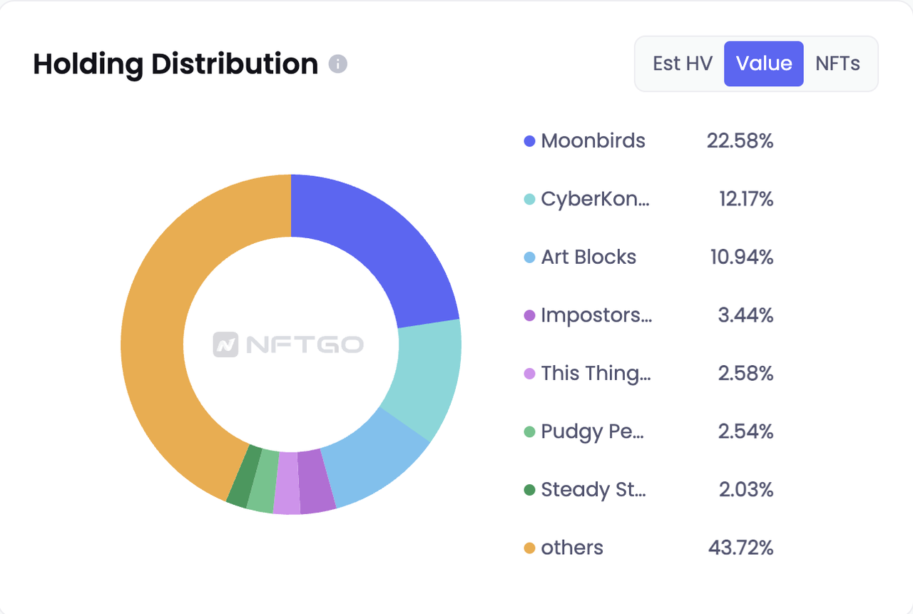 현재 보유 중인 NFT의 추정치에서 Art Blocks를 제외하면 Moonbirds는 해당 주소가 보유한 NFT 총 가치의 16.04%를 차지하며 2위를 차지한다. Moonbirds는 PROF에 의해 출시된 조류 기반의 NFT의 컬렉션이다. 또한 각 NFT는 개인 클럽 회원권, Moonbirds IP의 2세대 자격 등 많은 혜택을 받을 수 있다.