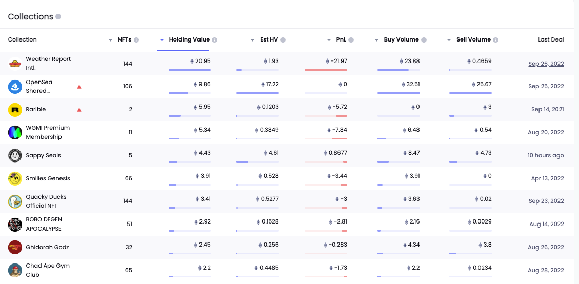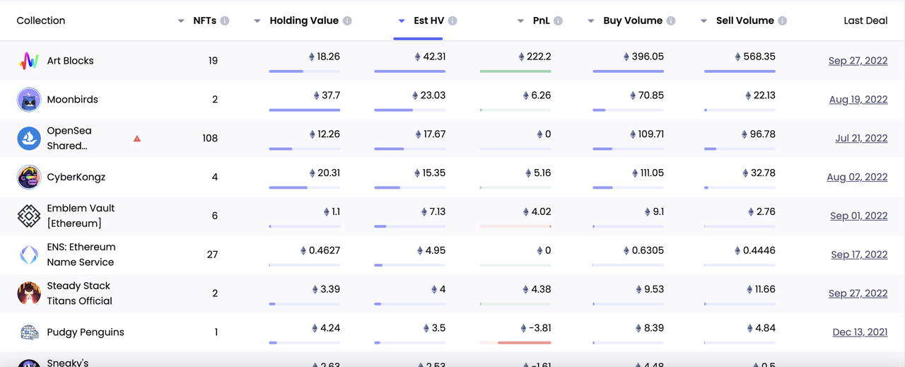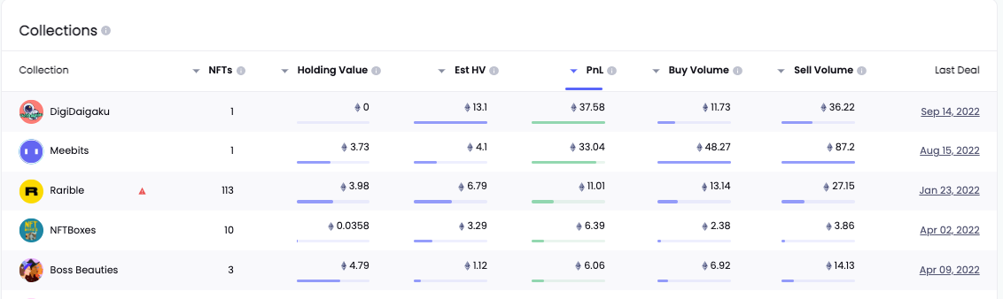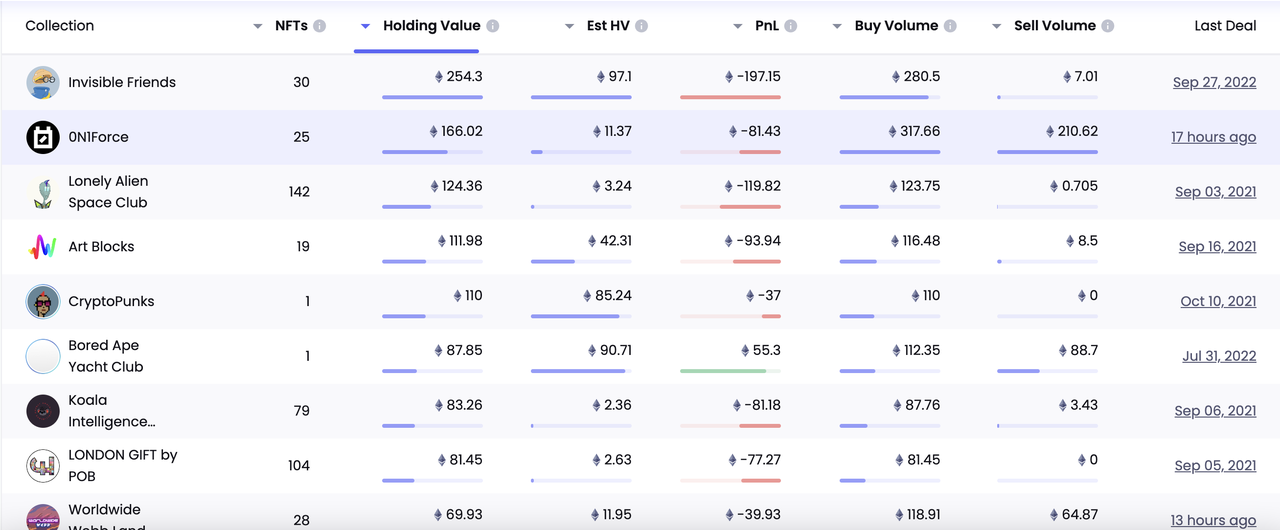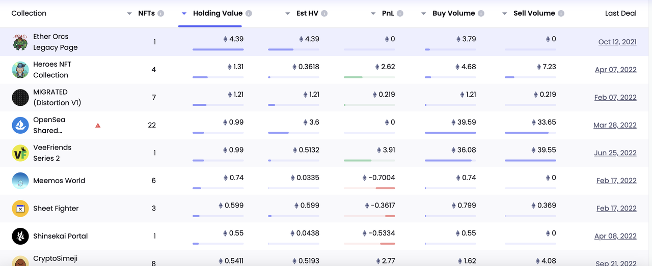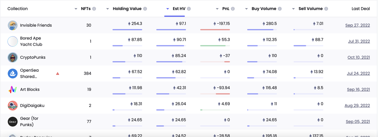 아래 표와 같이 이 주소는 한개의 BAYC를 가지고 있으며 예상이익을은 55.3ETH다. 또 이 주소는 CryptoPunk를 보유하고 있지만 잠재적인 손실은 37ETH로 추정되며, 판매량에 따르면 이 주소는 CryptoPunk를 1개만 구입하고 그 이후 계속 유지하고 있다.