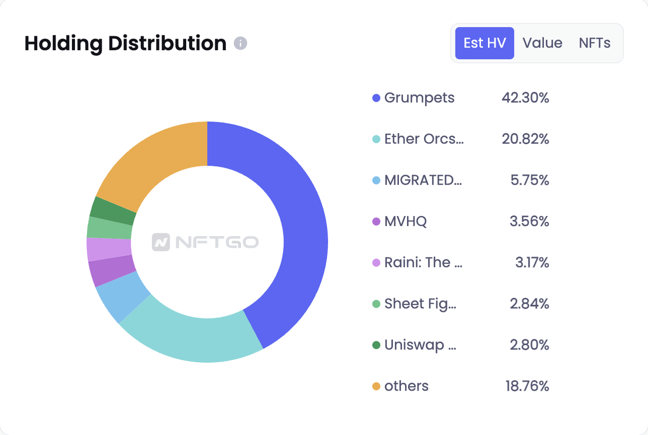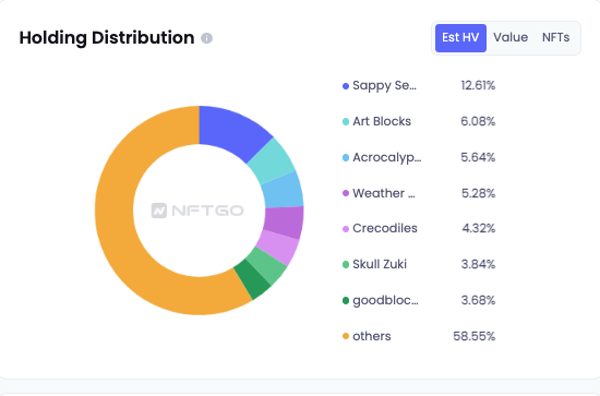 Sappy Seals는 이 주소가 현재 보유하고 있는 가장 가치 있는 프로젝트다. 이 프로젝트는 NFT 자산의 12.61%를 차지하고 있다. 또한 Griffden은 Art Blocks와 Acrocalypse NFT도 상당 수를 보유하고 있다. 그 중 하나인 Acrocalypse는 PFP 칼렉션일 뿐만 아니라 paperhands.gg의 생태계 NFT이며 이 NFT을 보유하고 있으면 Acrocalypse galaxy의 임무를 수행할 수 있다.