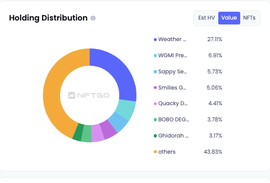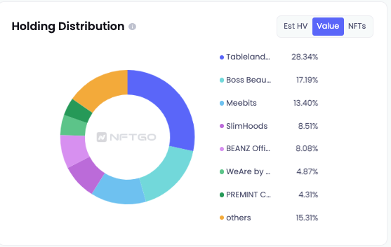 보유가치 분포도를 보면 Moonbirds가 1위, CyberKongs가 2위임을 알 수 있다. 이 시리즈에는 3종류의 콩즈가 포함되어 있으며, 최대 공급량은 20,000개이며 현재 시장 가치는 38.46kETH이다.아래 표에 따르면, CyberKongz에 있는 이 주소의 현재 예상 이익은 5.16E이다.