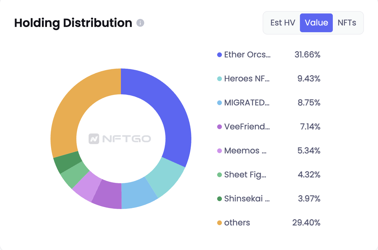 구매 시 주소의 가치 리스트에서는 Ether Orcs Legacy Page의 게임 NFT가 31.66%로 1위를 차지하고 있다.이 주소가 Game-Fi NFT에 일정 금액을 투자했음을 알 수 있다.