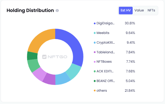 이 주소의 현재 추정치가 가장 높은 NFT 프로젝트는 DigiDaigaku로 전체의 30.81%를 차지한다. 그 다음은 Meebits다.