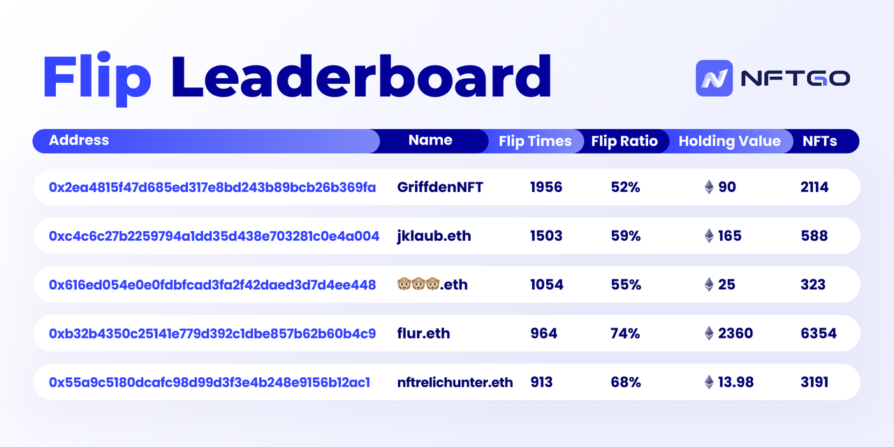 Flip Time(플립 시간) 및 Flip Ratio(플립 비율)는 NFT 데이터를 해독 할 때의 핵심 지표다. 플립(Flip)은 판매자가 NFT 거래에서 이익을 얻을 때, 즉 판매 가격이 구매 가격보다 높은 것을 가리킨다. 예를 들어, 한 NFT의 거래 이력을 볼 때 해당 NFT가 4회 판매되었고 이 4번의 거래가 모두 판매자에게 이익이 되었다면, 이는 해당 NFT의 컬렉션이 4회 플립되었음을 의미하며, 이에 대응하는 주소는 1회 플립 성공으로 기록된다.