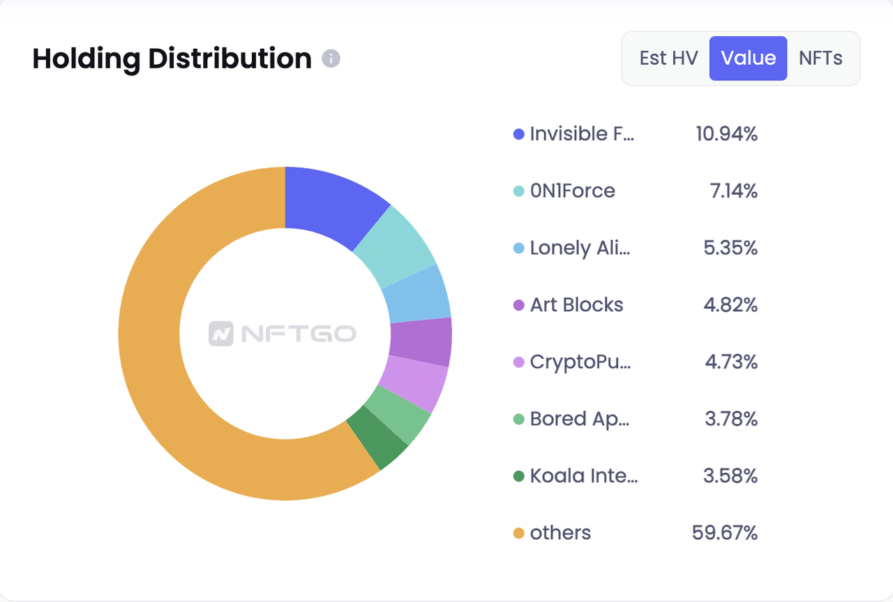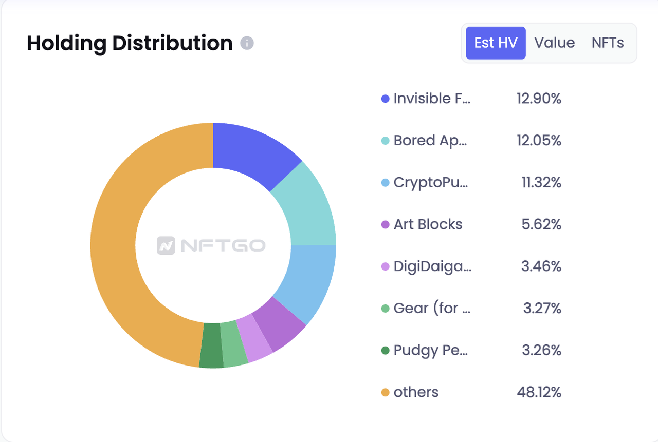 이 주소가 보유한 총 예상가치 상위 2개 프로젝트인 Invisible Friends와 BAYC는 각각 12.90%와 12.05%를 차지한다.