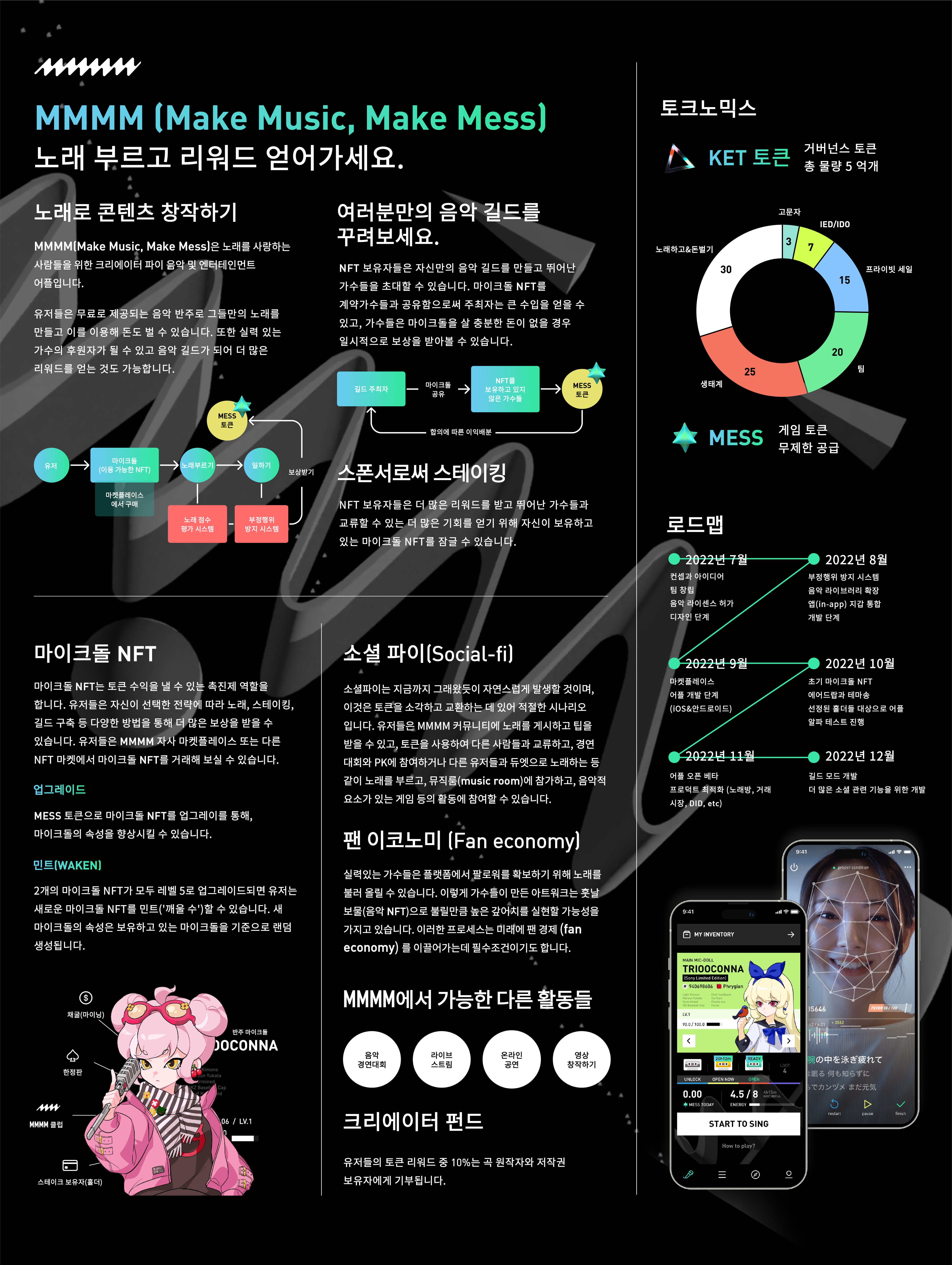 MMMM(4M,Make Music Make Mess)은 음악을 사랑하고 노래를 사랑하는 모든 사람들이 Web3 노래방에서 즐기며 수익을 창출할 수 있는 크리에이터 파이(Creator-Fi)이자 뮤직 엔터테인먼트 서비스로서 새로운 음악 축제의 장을 열고자 합니다. Web3와 노래방 기능을 결합하여 사용자들은 MIC-DOLL NFT를 소유하고 노래하고 녹음하여 게임 토큰 MESS를 얻을 수 있습니다. 자신의 음악을 친구들과 공유하며 선물을 보낼 수도 있고 팬 커뮤니티 등을 만들 수 있는 소셜파이(Social-Fi)앱입니다. 또한 뮤직 NFT 마켓플레이스를 통해 자신의 작품을 자유롭게 거래할 수 있습니다.