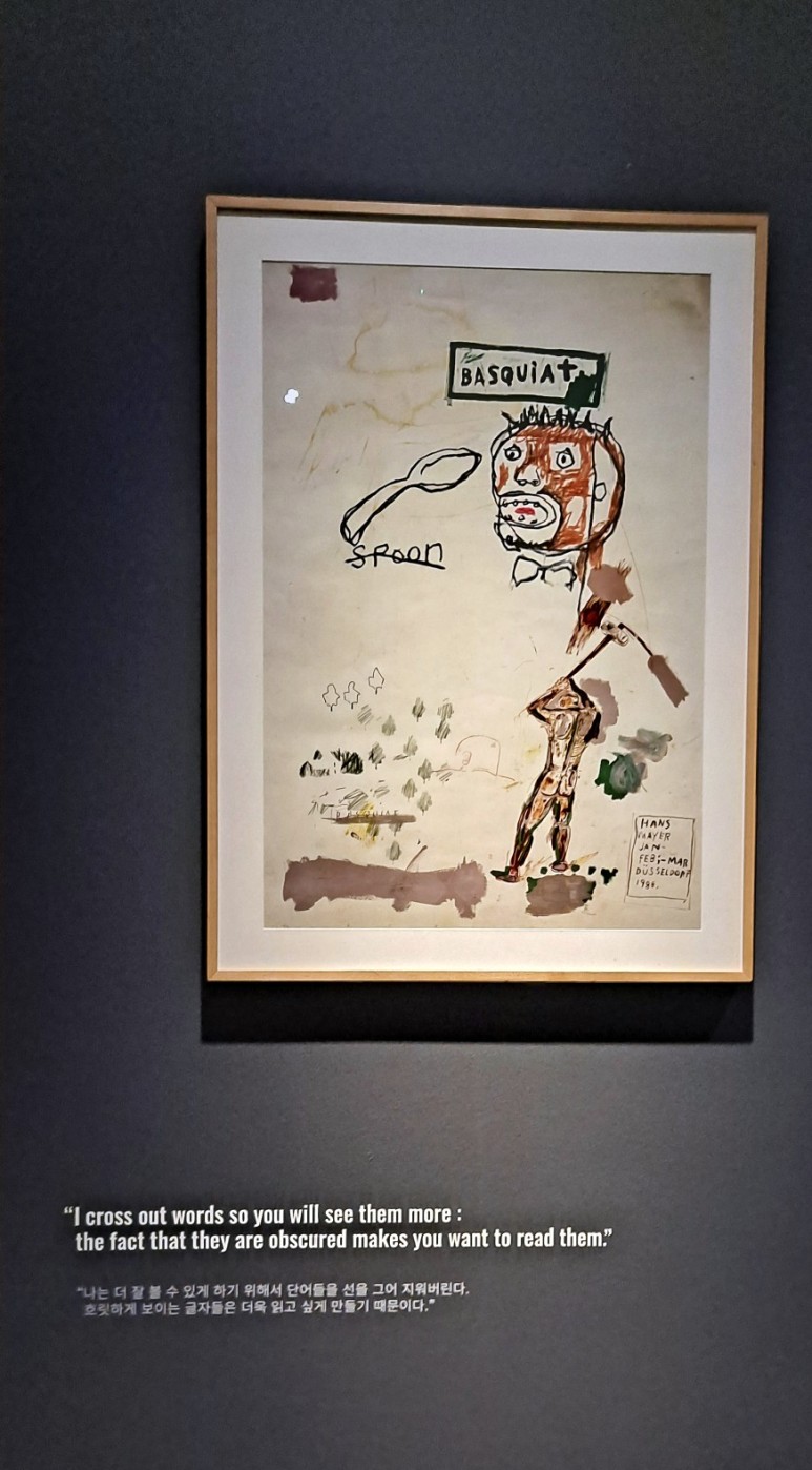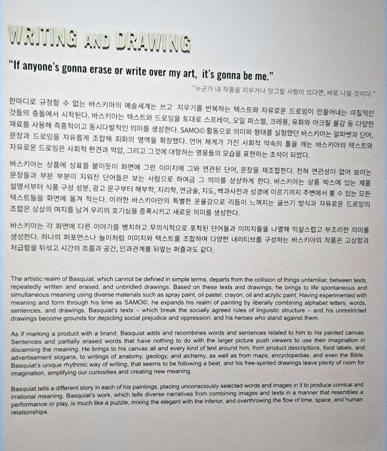 바스키아의 작품을 보면 그리고 나서 지워버리는 작업이 반복되었다. 모자이크 형식의 기법도 눈에 띄었고, 여러 문장과 단어들을 나열함으로써 'untitled'의 제목과는 달리 그의 작품이 의미하는 걸 글자를 읽으면서 유추해볼 수 있었다.