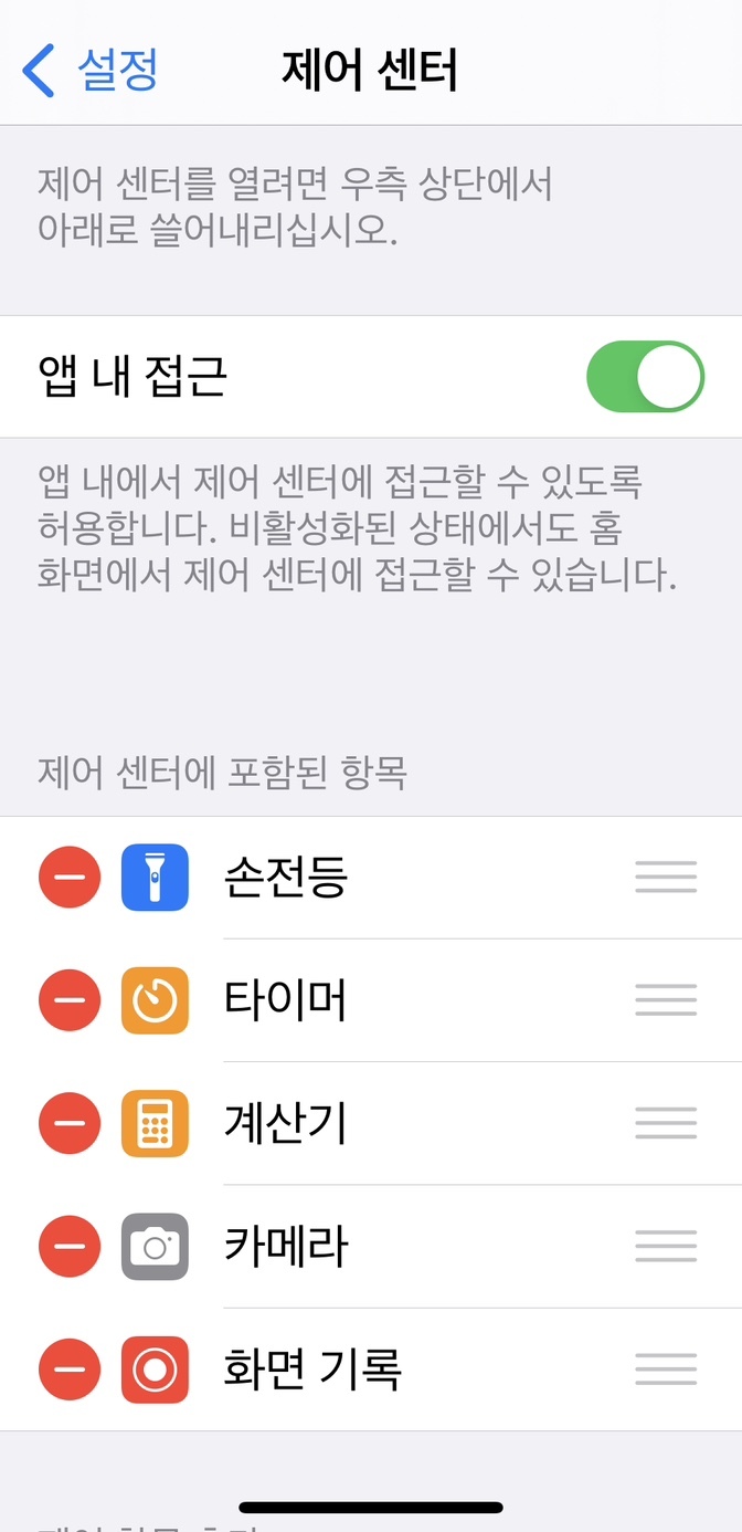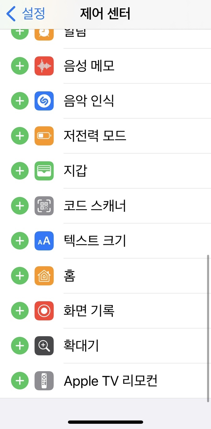 - 설정 -> 제어 센터 -> 화면 기록의 +를 클릭하면 제어 센터에 포함된 항목에 화면 기록이 나타난다.