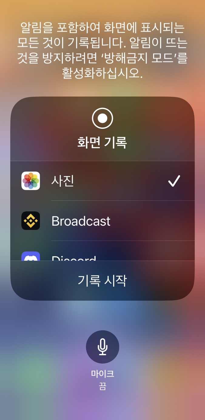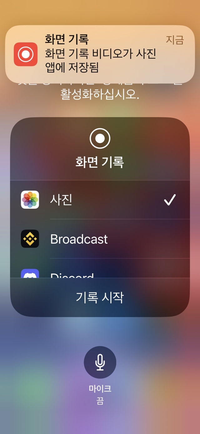 3. 화면 기록에서 '마이크 끔/마이크 켬'을 둘 중 하나를 선택하고 '기록 시작'을 누르면 아이폰 및 아이패드의 화면이 기록된다. 기록을 종료하면 사진앱에 자동 저장된다. 마이크를 켜면 외부 음성이 함께 녹화된다.