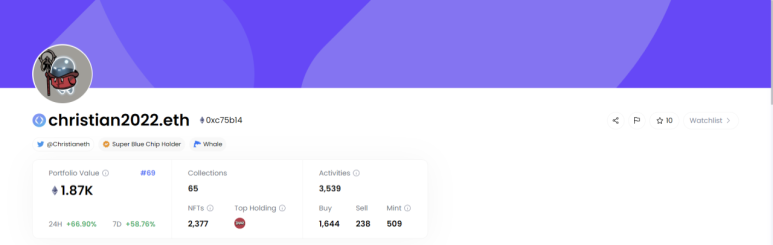Rewkang의 지갑인 Beanwhale.eth은 포트폴리오 가치 5.61k ETH를 기준으로 22위를 차지하고 있으며, 그의 지갑도 고래와 슈퍼 블루 칩 홀더로 등록되어 있다.