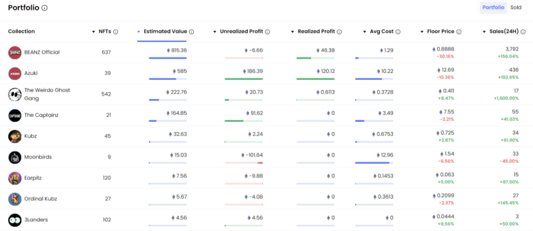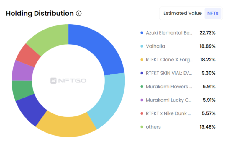 Rewkang의 지갑을 추정치로 필터링하면, 포트폴리오 분포는 주로 아즈키를 기반으로 79.99%를 차지하며, 그 다음으로 빈즈가 9.95%, BAYC가 5.90%를 차지하고 있다.