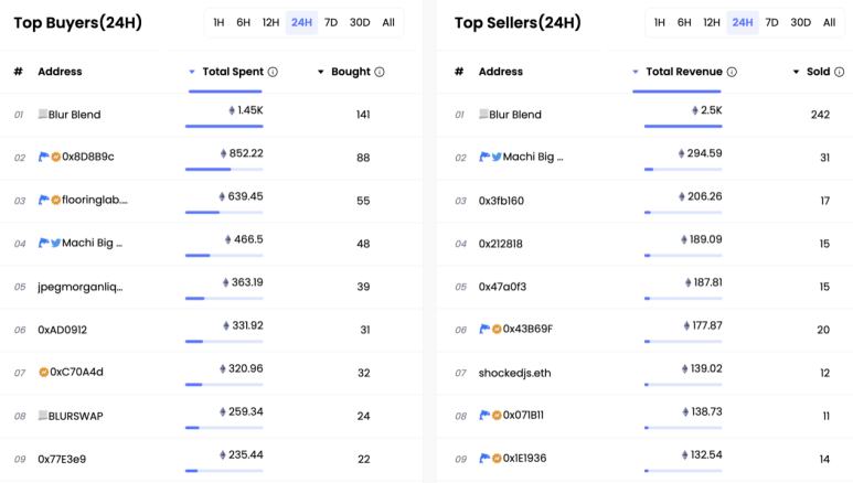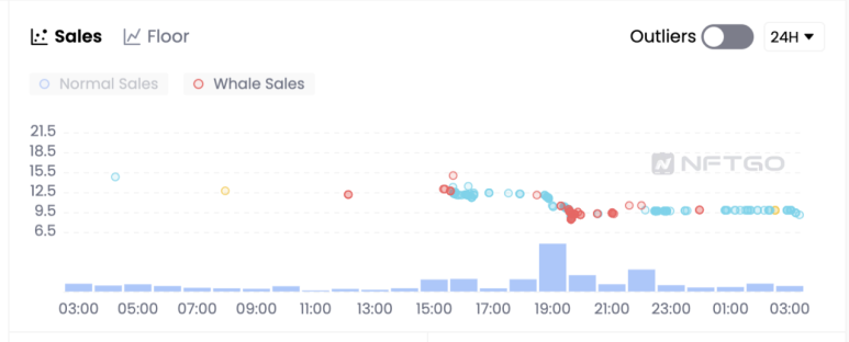 이러한 추세를 설명하는 한 가지 가능성은 홀더들이 블러(Blur)에서 입찰 및 대출 기회를 적극적으로 활용했다는 점이다. 판매 차트를 살펴보면 가격 하락 시에 많은 고래들이 움직임을 보이고 있음을 알 수 있다.
