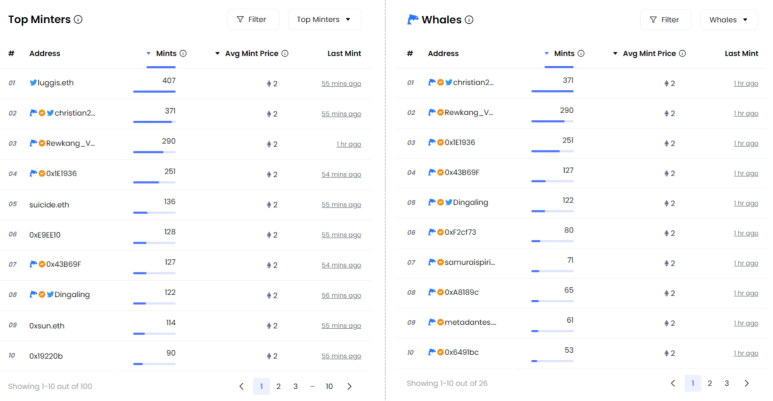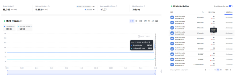 Luggi는 1단계와 2단계 사이에 407개의 아즈키 엘리멘탈를 민팅하였다. 이 과정에서 총 229달러의 가스 비용이 소요되었다. 또한 현재 1850개의 아즈키 엘리멘탈이 고래들에 의해 구입되었으며, 이를 위해 총 3.7k ETH, 700만 달러가 소비되었다. 상위 3마리의 고래들은 전체 민트 중 49.29%를 차지하고 있다.