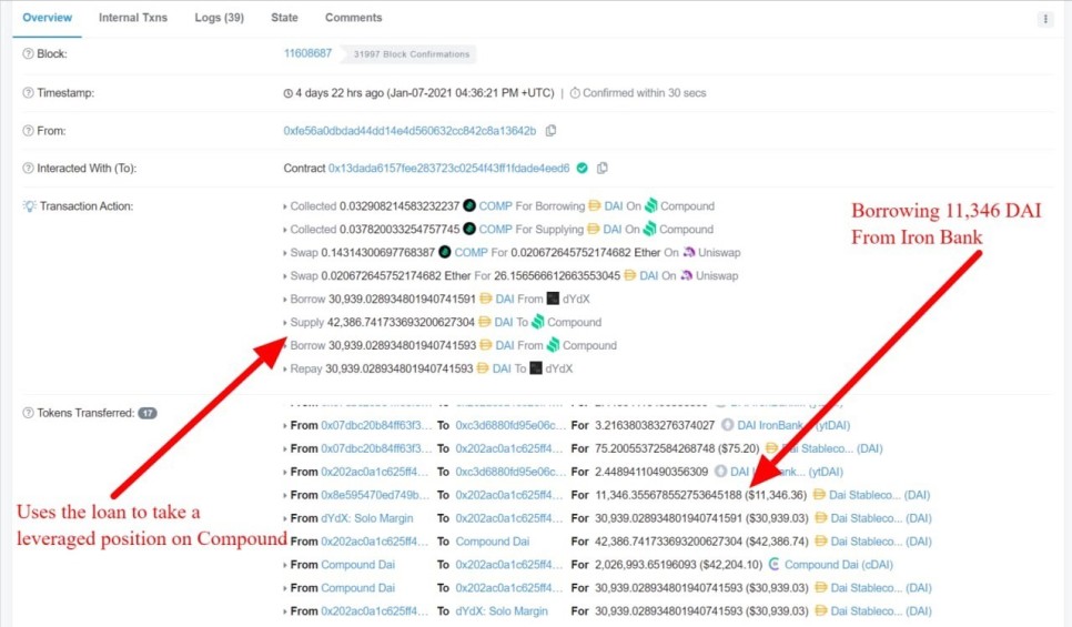 아이언 뱅크로부터 11,346개의 DAI를 빌려 컴파운드에서 레버리지 투자를 한 모습(출처: medium cream 계정)