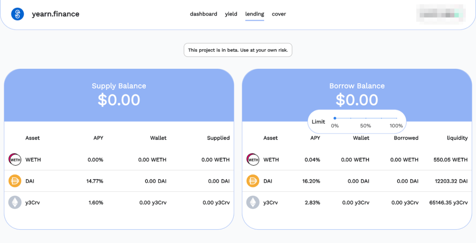 크림 v2로부터 대출을 받을 수 있는 자산은 wETH, DAI, y3Crv로 제한되며 연파이낸스의 대출 포털에서 찾아볼 수 있지만 아직 정식적으로 공개되지 않은 베타 버전이다.