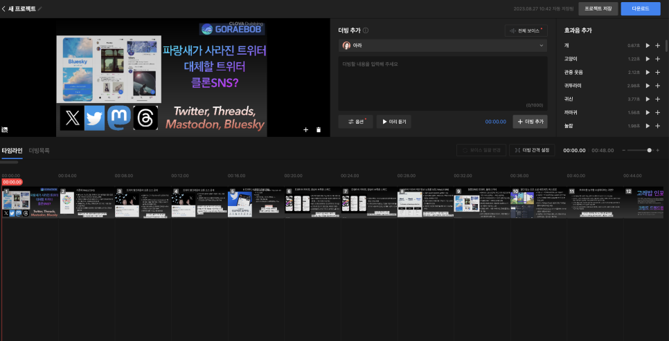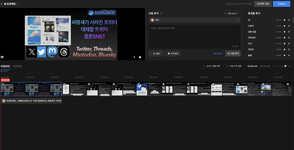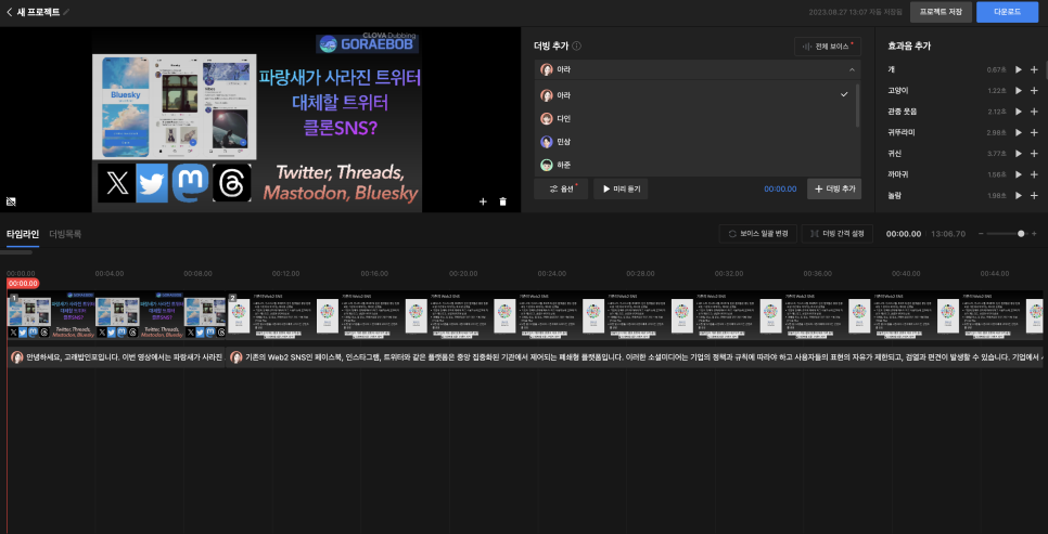 7. 프로젝트를 저장하고 나면 영상 파일, 음원 파일, 개별 더빙 파일로 저장할 수 있으며, 다운로드 횟수 및 글자수가 차감됩니다. 영상을 자주 제작하지 않는 경우엔 무료로 사용해도 충분할 듯 하고, 자주 제작하는 경우는 유료요금제를 추천드립니다.