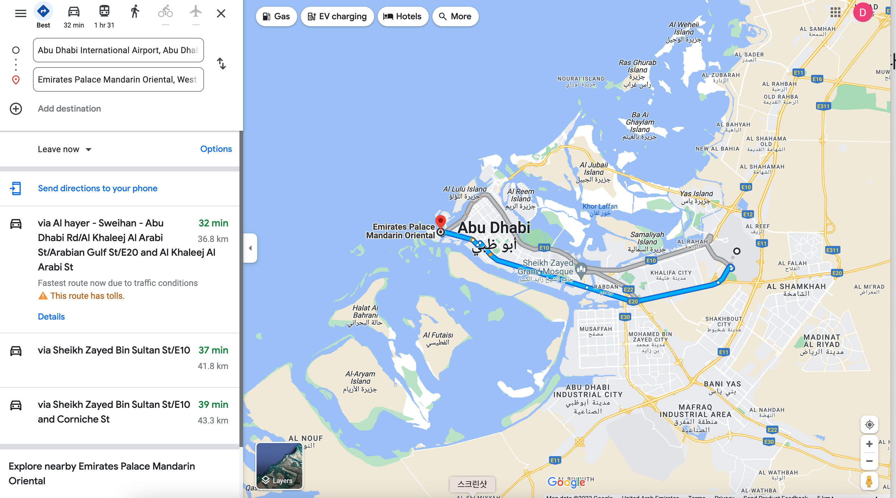 아부다비 국제공항에서 약 30여분 정도 떨어져 있다. 코니쉬 로드를 따라 가다보면 오른쪽에는 자이드 빈 술탄 알 나하얀에 대한 창립자 기리비물 "창립자 메모리얼"과 왼쪽에는 ADNOC 본부가 근처에 있다.