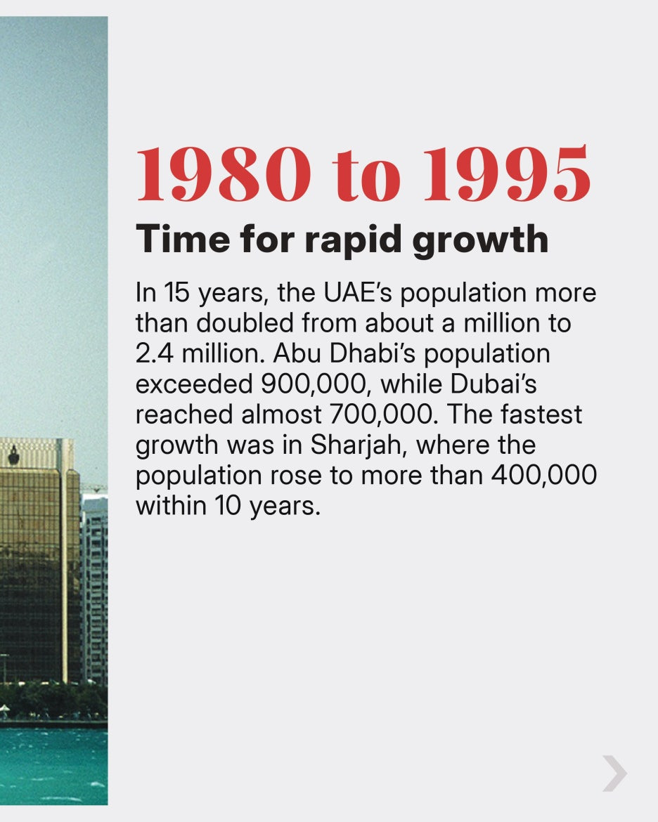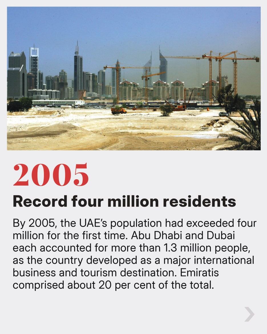 UAE는 400만 인구를 처음으로 돌파했다. 아부다비와 두바이는 각각 130만 명 이상을 기록하며, 국제 비즈니스 및 관광지로 부상했다. 에미라티 국민은 전체의 20%로 감소했다.