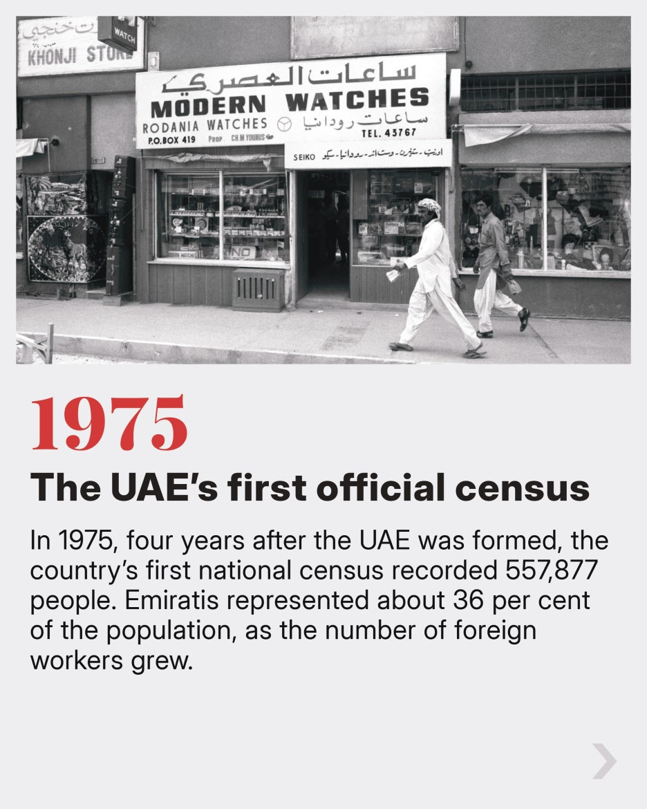 연방이 형성된 지 4년 후, UAE는 첫 공식 인구조사에서 557,877명을 기록했다.