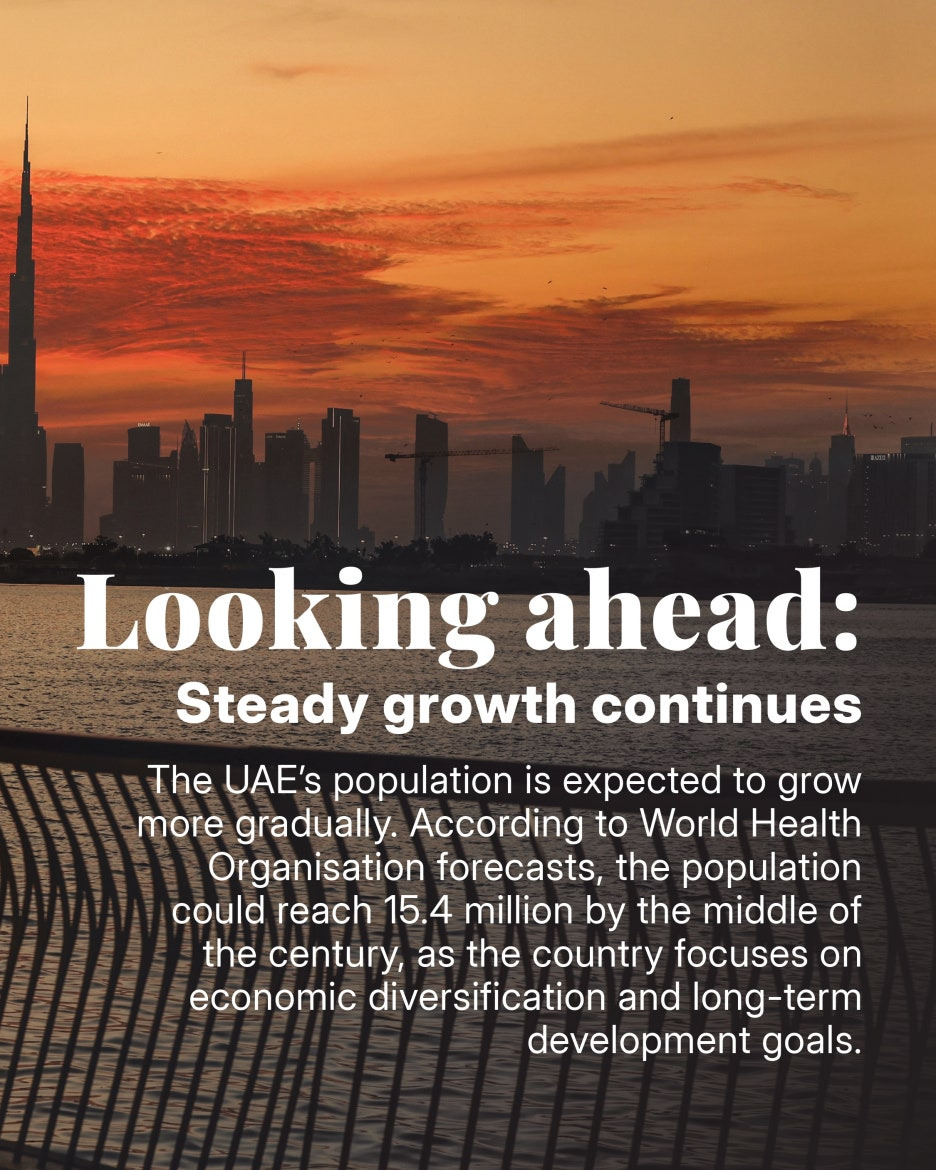 WHO 예측에 따르면 UAE 인구는 2050년경 1,540만 명에 이를 수 있다. UAE는 경제 다변화 및 장기 개발 목표에 집중할 것이다.