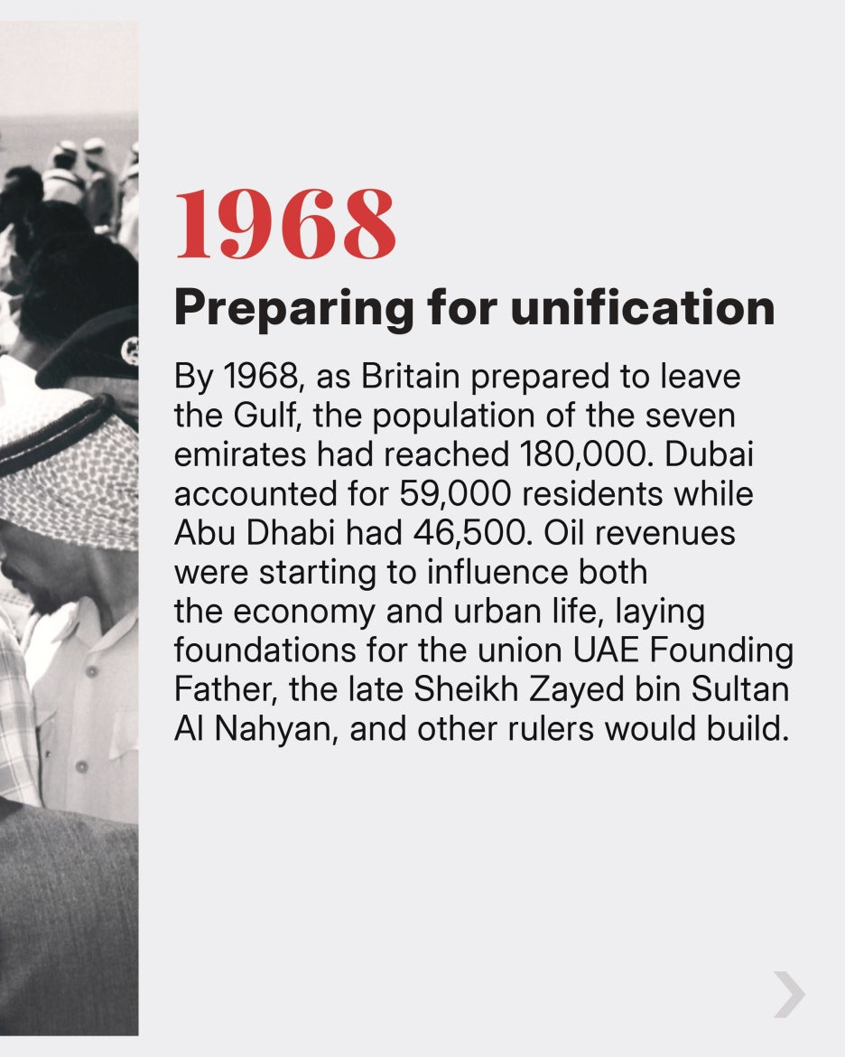 영국의 걸프 지역 철수 준비와 함께, 7개 토후국의 인구는 18만 명에 도달했다. 두바이에는 약 59,000명, 아부다비는 46,500명이 거주했다. 석유 수익이 경제와 도시화에 영향을 주기 시작했다. 이는 국부이자 UAE의 창립자인 자예드 국왕(Sheikh Zayed)과 다른 통치자들이 연합을 건설할 기반이 되었다.