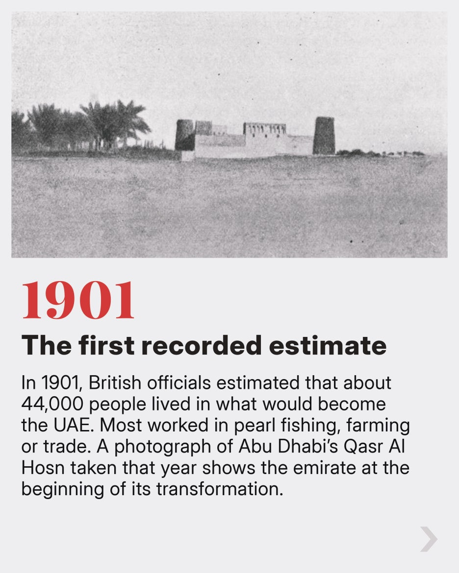 영국 당국은 약 44,000명이 현재의 UAE 지역에 거주하고 있다고 추정했다. 대부분은 진주 채취, 농업, 무역에 종사했다. 당시 아부다비의 카스르 알 호슨(Qasr Al Hosn) 사진은 에미레이트가 변화의 초입에 있었음을 보여준다.