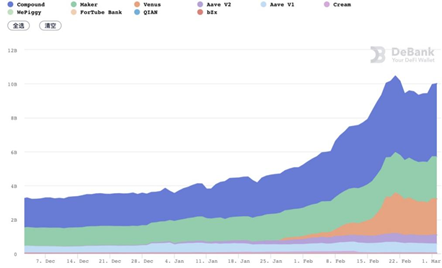 대출 프로토콜을 통한 총 대출량은 전월보다 86% 늘어난 94억 달러 수준이다. 대표적인 대출 프로토콜 중 하나인 컴파운드의 대출량은 40억 달러를 돌파해 전체 대출량의 43%를 차지했다. 바이낸스 스마트 체인 상의 비너스의 경우, 비너스의 대출량은 이미 에이브 v1과 v2 두 버전을 합친 수준을 넘었으며 전체 비중으로는 3%에서 20%로 높아졌다.