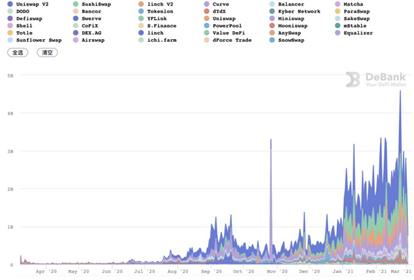 이더리움의 탈중앙화 거래소(DEX)에 일일 거래량이 최고치를 달성했다. 2월 말에는 일일 거래량이 28억 달러에 이르렀고 이는 전월 대비 55% 증가한 수치이다. 2월 23일, 거래소의 전체 거래량은 45억 8000만 달러로 지난해 10월의 33억 달러에 비해 38.8% 늘었다.