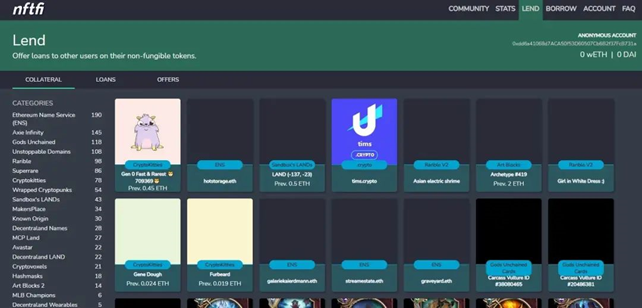 향후 NFT 확장성과 관해 업계의 기대를 받는 분야는 NFT20 출현 이후 발생할 유동성과 디파이와 결합된 NFT 영역이다. NFT와 디파이 결합 시, 가장 빠르게 응용될 곳은 바로 ‘담보 대출’ 분야이다. NFTfi를 예로, 차입자가 임의의 ERC-721토큰(NFT 자산)을 담보로 맡기고 그에 상응하는 가치의 wETH나 DAI를 대출받는 서비스다. 해당 NFT 자산은 차입자가 대출금을 상환하기 전까지 NTFfi의 스마트 컨트랙트에 락업된다. 만약 차입자가 기간 안에 대출금을 갚지 못하면 NFT는 거래자에게 넘어간다. 차입자가 희망하는 금액, 상환 기간, 이자 등을 설정할 수 있으며 차입 기간은 7일, 14일, 30일, 90일로 다양하다.