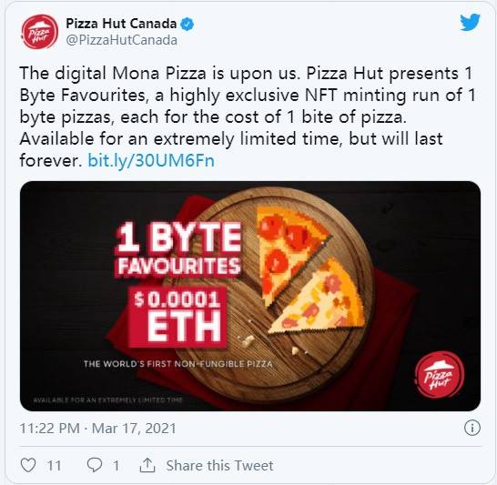 타코벨을 소유하고 있는 피자헛 캐나다는 픽셀화 된 피자를 0.0001 ETH ($ 0.18)에 라리블(Rarible)에 올렸다. 이 아이디어는 피자 한 입 가격처럼 저렴해야한다는 것이었다. 캠페인을 담당하는 대행사인 오길비(Ogilvy)의 크리에이티브 디렉터인 메간 파쿠하르(Megan Farquhar)는 다음과 같이 말했다.