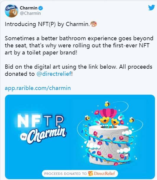P&G의 브랜드 샤르민(Charmin)은 이번 주 Non-Fungible Toilet Paper라는 이름의 "NFTP"아트 작품 시리즈를 발표하면서 눈쌀을 찌푸리게 했다. Charmin NFT에 대한 입찰은 0.15 ETH($ 264.72)에 달했으며 수익금은 인도주의 지원 자선 단체인 다이렉트 릴리프(Direct Relief)로 전달되었다.