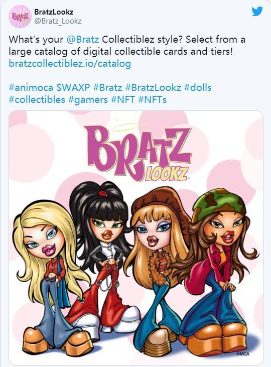 MGA 엔터테인먼트의 브라츠(Bratz) 프랜차이즈는 장난감 인형, 영화, TV 프로그램, 게임 등을 지난 12월 애니모카(Animoca) 브랜드와 제휴하여 수집 가능한 카드 형태로 일련의 "NFT 인형"을 제작했다. 가장 희귀한 '쉬머린'은 실제 인형으로 대체할 수 있었다.