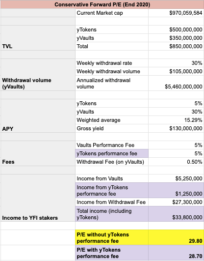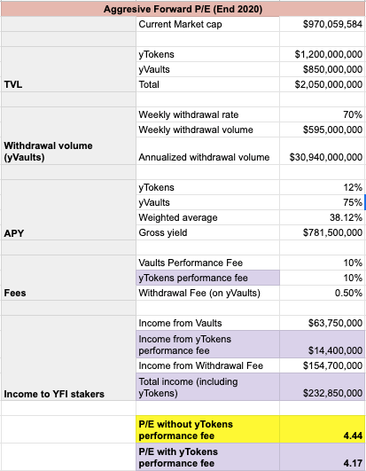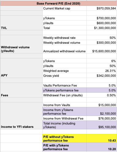 진행 전 한 가지 참고 사항: 현재 성과 수수료가 yVault에만 적용되기 때문에 각 사례에 대해 두 가지 서로 다른 P/E 계산을 포함했는데, 하나는 yVault 수익에만 성과 수수료가 적용되고 다른 하나는 yVault 및 yToken 수익에 모두 적용된다. yToken 수익에 대한 성과 수수료를 통합하는 셀은 연한 보라색으로 음영 처리된다.