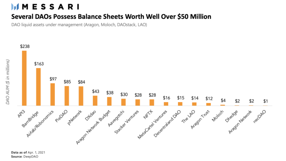 지난 2021년 1분기 Web3 재단은 NFT 관련 프로젝트들을 순차적으로 출시하며 많은 관심을 이끌었다. 하지만 최근 발표된 Messari 보고서에 따르면, 1분기 NFT에 몰렸던 관심은 분산형 자율 조직인 DAO로 천천히 이동하고 있는 것으로 평가하고 있다. 이는 DeepDAO 데이터를 참고하면 이해할 수 있는데, 현재 DAO 생태계에서 관리하는 총 자산은 9억 3100만 달러를 돌파하였다.